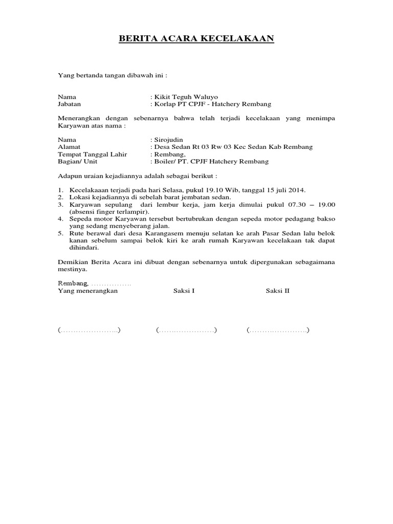 Contoh Berita Acara Kejadian Kecelakaan Kerja / Download Contoh Berita Acara Kronologis Kecelakaan Kerja Untuk / Contoh berita acara kronologis kejadian.. Contoh berita acara kronologis kecelakaan kerja untuk mp3 & mp4. Tanya jawab seputar surat kronologis kejadian. Contoh berita acara kejadian kecelakaan. Yang bertanda tangan dibawah ini : Meresmikan beberapa keputusan rapat sebelumnya 3.